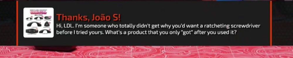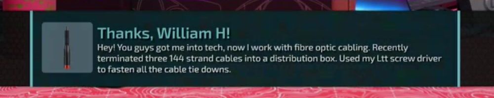 Thanks, William H! Hey! You guys got me into tech, now I work with fibre optic cabling. Recently terminated three 144 strand cables into a distribution box. Used my Ltt screw driver to fasten all the cable tie downs.