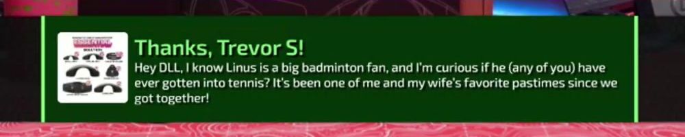 Thanks, Trevor S! Hey DLL, I know Linus is a big badminton fan, and I'm curious if he (any of you) have ever gotten into tennis? It's been one of me and my wife's favorite pastimes since we got together!
