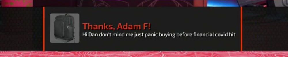 Thanks, Adam F! Hi Dan don't mind me just panic buying before financial covid hit