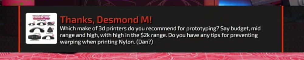 Thanks, Desmond M! Which make of 3d printers do you recommend for prototyping? Say budget, mid range and high, with high in the $2k range. Do you have any tips for preventing warping when printing Nylon. (Dan?)
