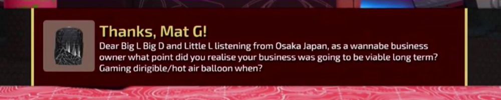 Thanks, Mat G! Dear Big L Big D and Little L listening from Osaka Japan, as a wannable business owner what point did you realise your business was going to be viable long term? Gaming dirigible/hot air balloon when?
