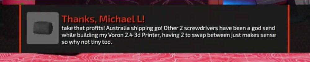 Thanks, Michael L! take that profits! Australia shipping go! Other 2 screwdrivers have been a god send while building my Voron 2.4 3d Printer, having 2 to swap between just makes sense so why not tiny too.