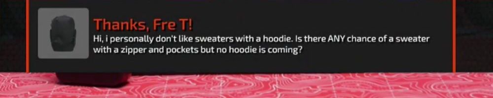 Thanks, Fre T! Hi, i personally don't like sweaters with a hoodie. Is there ANY chance of a sweater with a zipper and pockets but no hoodie is coming?