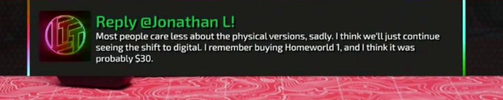 Reply @Jonathan L! Most people care less about the physical versions, sadly. I think we'll just continue seeing the shift to digital. I remember buying Homeworld 1, and I think it was probably $30.