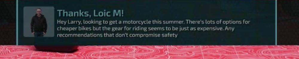 Thanks, Loic M! Hey Larry. looking to get a motorcycle this summer. There's lots of options for cheaper bikes but the gear for riding seems to be just as expensive. Any recommendations that don't compromise safety