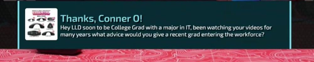 Thanks, Conner O! Hey LLD soon to be College Grad with a major in IT, been watching your videos for many years what advice would you give a recent grad entering the workforce?