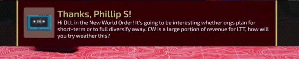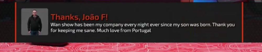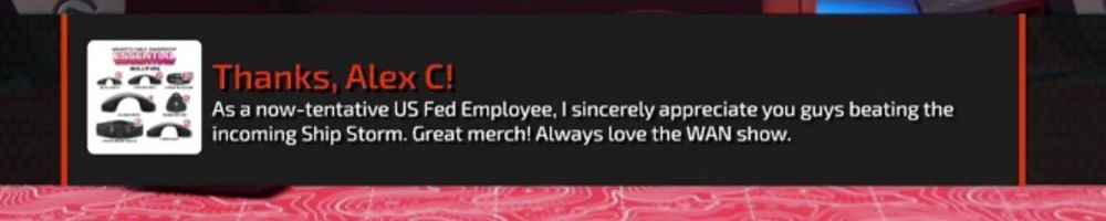 Thanks, Alex C! As a now-tentative US Fed Employee, I sincerely appreciate you guys beating the incoming Ship Storm. Great merch! Always love the WAN show.