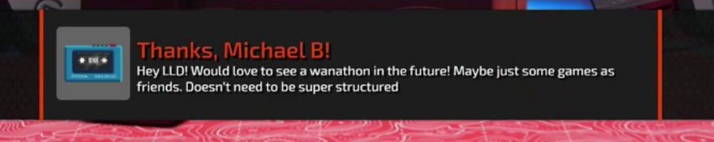 Thanks, Michael B! Hey LLD! Would love to see a wanathon in the future! Maybe just some games as friends. Doesn't need to be super structured