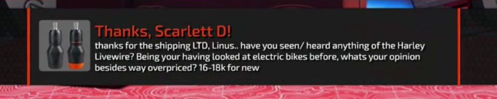 Thanks, Scarlett D! thanks for the shipping LTD, Linus.. have you seen/ heard anything of the Harley Livewire? Being your having looked at electric bikes before, whats your opinion besides way overpriced? 16-18k for new