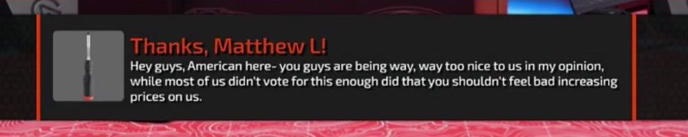 Thanks, Matthew L! Hey guys, American here- you guys are being way, way too nice to us in my opinion, while most of us didn't vote for this enough did that you shouldn't feel bad increasing prices on us.