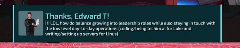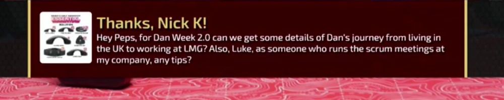 Thanks, Nick K! Hey Peps, for Dan Week 2.0 can we get some details of Dan's journey from living in the UK to working at LMG? Also, Luke, as someone who runs the scrum meetings at my company, any tips?