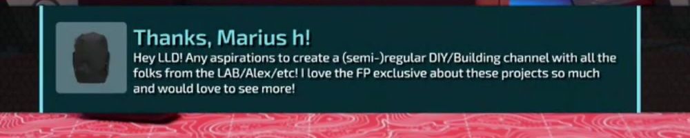 Thanks, Marius h! Hey LLD! Any aspirations to create a (semi-)regular DIY/Building channel with all the folks from the LAB/Alex/etc! I love the FP exclusive about these projects so much and would love to see more!