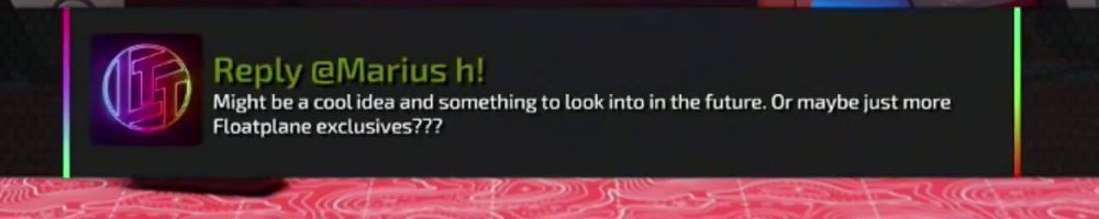 Reply @Marius h! Might be a cool idea and something to look into in the future. Or maybe just more Floatplane exclusives???