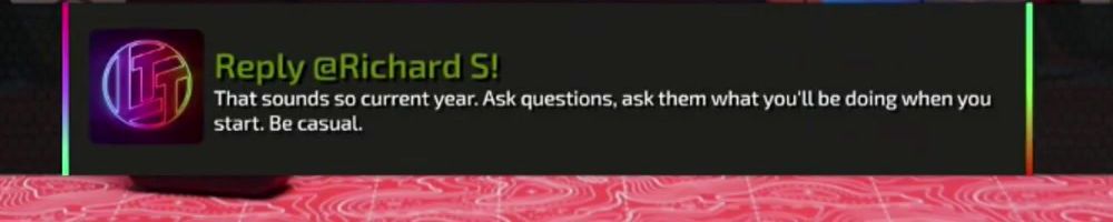 Reply @Richard S! That sounds so current year. Ask questions, ask them what you'll be doing when you start. Be casual.