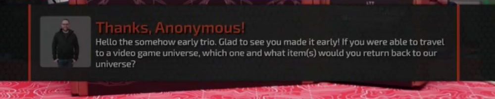 Hello the somehow early trio. Glad to see you made it early! If you were able to travel to a video game universe, which one and what item(s) would you return back to our universe?