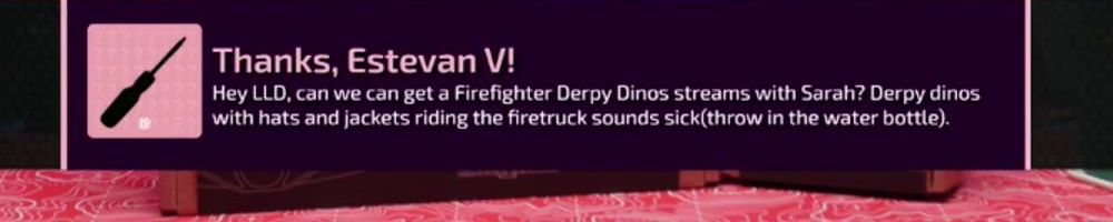 Hey LLD, can we can get a Firefighter Derpy Dinos streams with Sarah? Derpy dinos with hats and jackets riding the firetruck sounds sick(throw in the water bottle).