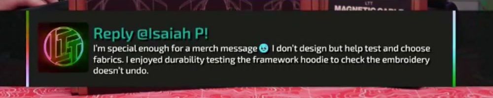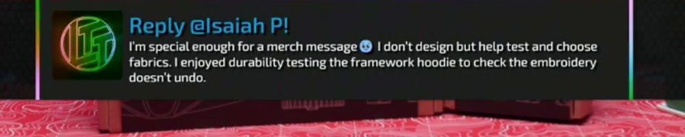 I'm special enough for a merch message 😅 I don't design but help test and choose fabrics. I enjoyed durability testing the framework hoodie to check the embroidery doesn't undo.