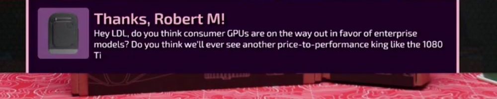 Hey LDL, do you think consumer GPUs are on the way out in favor of enterprise models? Do you think we'll ever see another price-to-performance king like the 1080 Ti