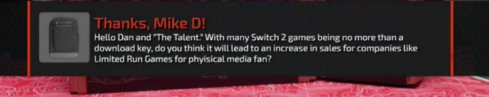 Hello Dan and "The Talent." With many Switch 2 games being no more than a download key, do you think it will lead to an increase in sales for companies like Limited Run Games for physical media fan?