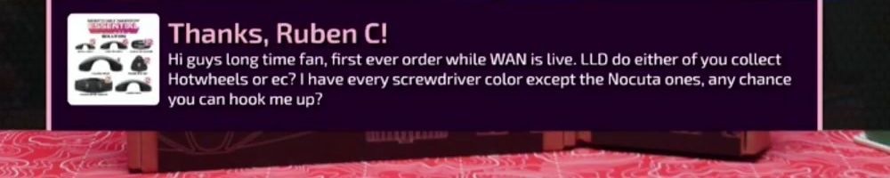 Hi guys long time fan, first ever order while WAN is live. LLD do either of you collect Hotwheels or ec? I have every screwdriver color except the Nocuta ones, any chance you can hook me up?