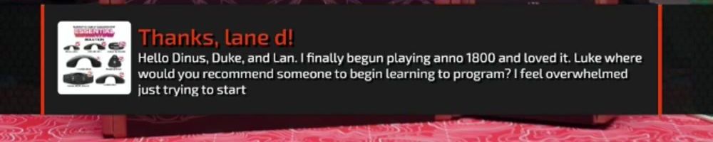 Hello Dinus, Duke, and Lan. I finally begun playing anno 1800 and loved it. Luke where would you recommend someone to begin learning to program? I feel overwhelmed just trying to start