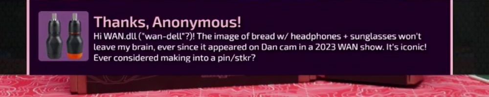 Hi WAN.dll ("wan-dell"?)! The image of bread w/ headphones + sunglasses won't leave my brain, ever since it appeared on Dan cam in a 2023 WAN show. It's iconic! Ever considered making into a pin/stkr?