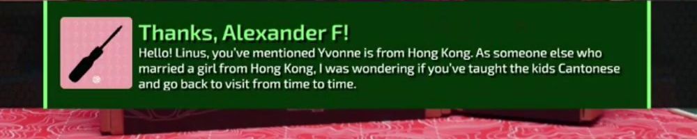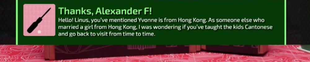 Hello! Linus, you've mentioned Yvonne is from Hong Kong. As someone else who married a girl from Hong Kong, I was wondering if you've taught the kids Cantonese and go back to visit from time to time.
