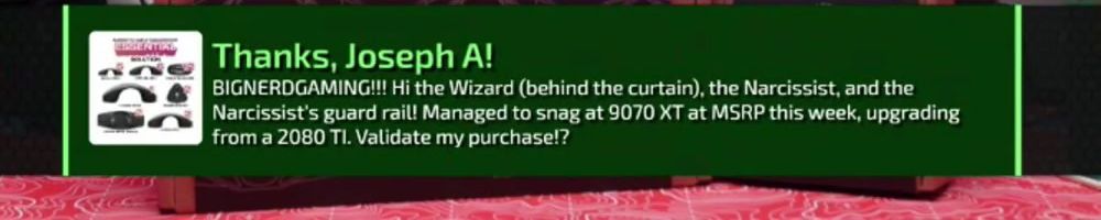 BIGNERDGAMING!!! Hi the Wizard (behind the curtain), the Narcissist, and the Narcissist's guard rail! Managed to snag at 9070 XT at MSRP this week, upgrading from a 2080 TI. Validate my purchase!?