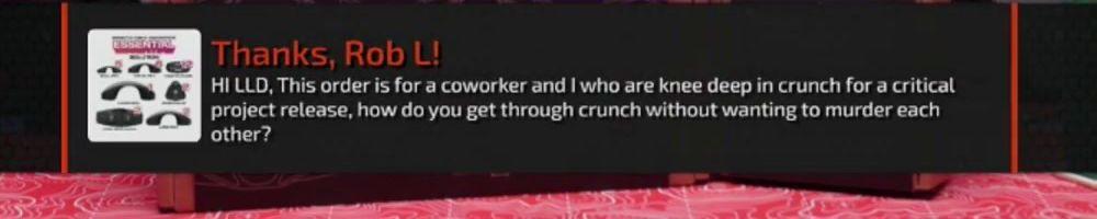 HI LLD, This order is for a coworker and I who are knee deep in crunch for a critical project release, how do you get through crunch without wanting to murder each other?