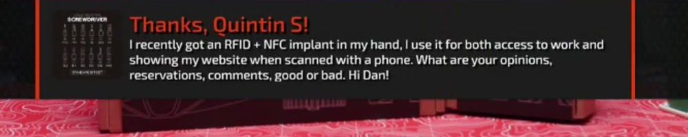 I recently got an RFID + NFC implant in my hand, I use it for both access to work and showing my website when scanned with a phone. What are your opinions, reservations, comments, good or bad. Hi Dan!