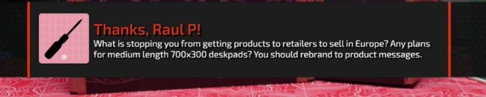 What is stopping you from getting products to retailers to sell in Europe? Any plans for medium length 700x300 deskpads? You should rebrand to product messages.