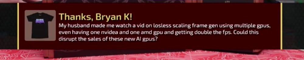 My husband made me watch a vid on losless scaling frame gen using multiple gpus, even having one nvidea and one amd gpu and getting double the fps. Could this disrupt the sales of these new Al gpus?