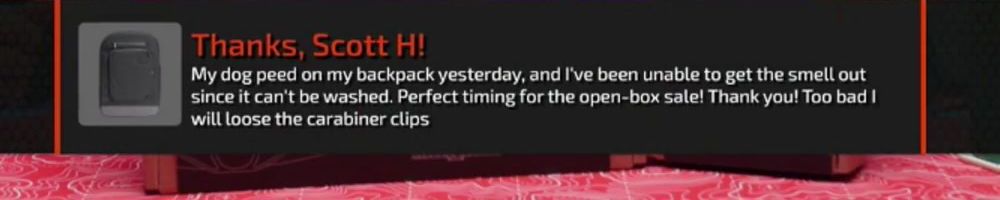 My dog peed on my backpack yesterday, and I've been unable to get the smell out since it can't be washed. Perfect timing for the open-box sale! Thank you! Too bad I will loose the carabiner clips