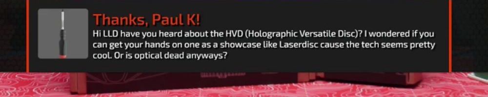 Hi LLD have you heard about the HVD (Holographic Versatile Disc)? I wondered if you can get your hands on one as a showcase like Laserdisc cause the tech seems pretty cool. Or is optical dead anyways?