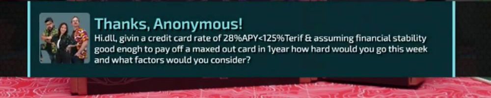 Hi.dll, givin a credit card rate of 28%APY<125%Terif & assuming financial stability good enogh to pay off a maxed out card in Tyear how hard would you go this week and what factors would you consider?