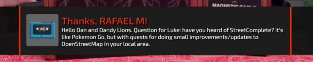 Hello Dan and Dandy Lions. Question for Luke: have you heard of StreetComplete? It's like Pokemon Go, but with quests for doing small improvements/updates to OpenStreetMap in your local area.