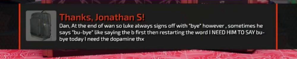 Dan, At the end of wan so luke always signs off with "bye" however , sometimes he says "bu-bye” like saying the b first then restarting the word I NEED HIM TO SAY bu- bye today I need the dopamine thx