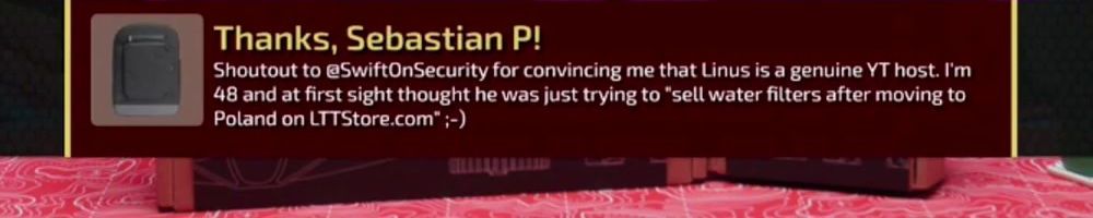 Shoutout to @SwiftOnSecurity for convincing me that Linus is a genuine YT host. I'm 48 and at first sight thought he was just trying to "sell water filters after moving to Poland on LTTStore.com" ;-)