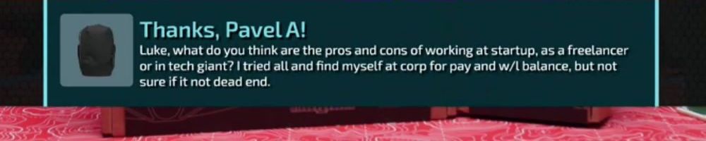 Luke, what do you think are the pros and cons of working at startup, as a freelancer or in tech giant? I tried all and find myself at corp for pay and w/l balance, but not sure if it not dead end.