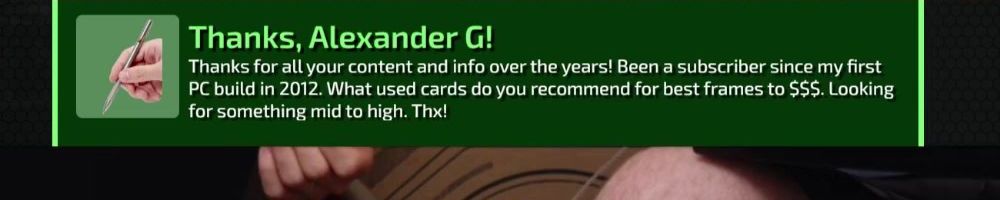 Thanks, Alexander G! Thanks for all your content and info over the years! Been a subscriber since my first PC build in 2012. What used cards do you recommend for best frames to $55. Looking for something mid to high. Thx!
