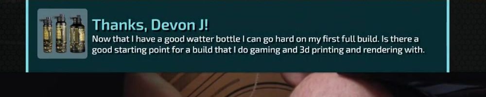 Thanks, Devon J! Now that I have a good watter bottle I can go hard on my first full build. Is there a good starting point for a build that I do gaming and 3d printing and rendering with.