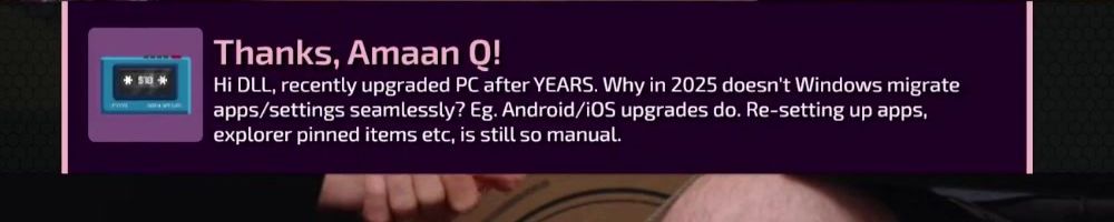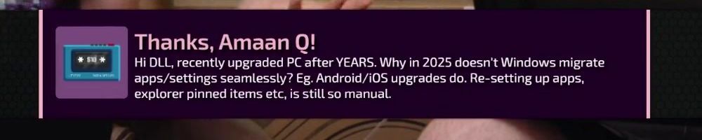 Thanks, Amaan Q! Hi DLL, recently upgraded PC after YEARS. Why in 2025 doesn't Windows migrate apps/settings seamlessly? Eg. Android/iOS upgrades do. Re-setting up apps, explorer pinned items etc, is still so manual.