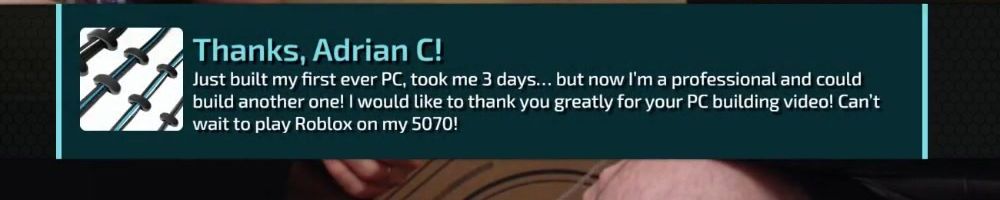 Thanks, Adrian C! Just built my first ever PC, took me 3 days... but now I'm a professional and could build another one! I would like to thank you greatly for your PC building video! Can't wait to play Roblox on my 5070!
