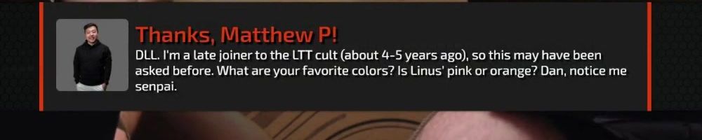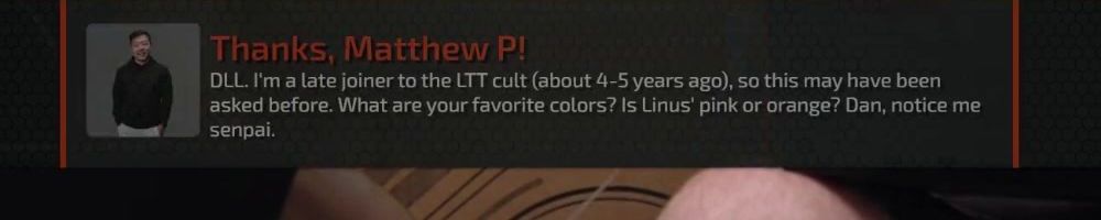Thanks, Matthew P! DLL. I'm a late joiner to the LTT cult (about 4-5 years ago), so this may have been asked before. What are your favorite colors? Is Linus’ pink or orange? Dan, notice me senpai.