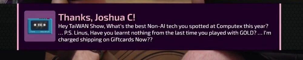 Thanks, Joshua C! Hey TaiWAN Show, What's the best Non-AI tech you spotted at Computex this year? ... P.S. Linus, Have you learnt nothing from the last time you played with GOLD? ... I'm charged shipping on Giftcards Now??