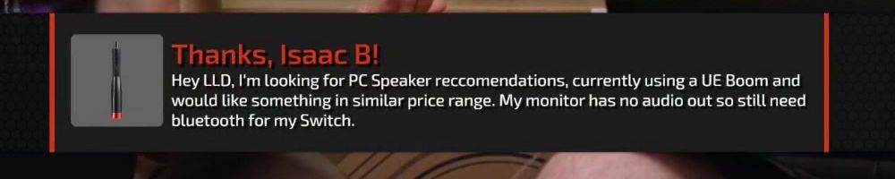 Thanks, Isaac B! Hey LLD, I'm looking for PC Speaker recommendations, currently using a UE Boom and would like something in similar price range. My monitor has no audio out so still need bluetooth for my Switch.