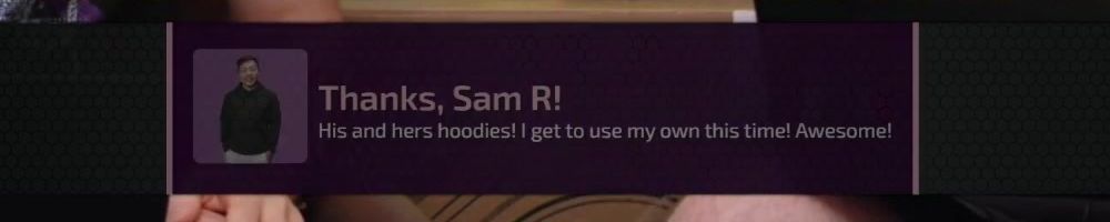 Thanks, Sam R! His and hers hoodies! I get to use my own this time! Awesome!