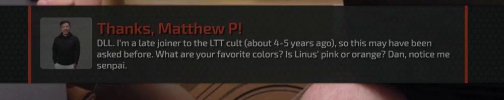 Thanks, Matthew P! DLL. I'm a late joiner to the LTT cult (about 4-5 years ago), so this may have been asked before. What are your favorite colors? Is Linus' pink or orange? Dan, notice me senpai.