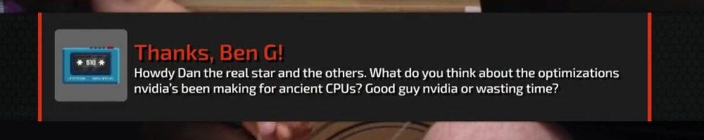 Thanks, Ben G! Howdy Dan the real star and the others. What do you think about the optimizations nvidia's been making for ancient CPUs? Good guy nvidia or wasting time?