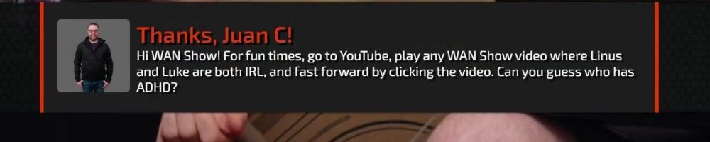 Thanks, Juan C! Hi WAN Show! For fun times, go to YouTube, play any WAN Show video where Linus and Luke are both IRL, and fast forward by clicking the video. Can you guess who has ADHD?